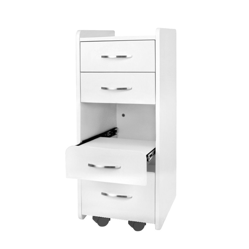Szafka z 4 szufladami na prowadnicach rolkowych kolorze białym.