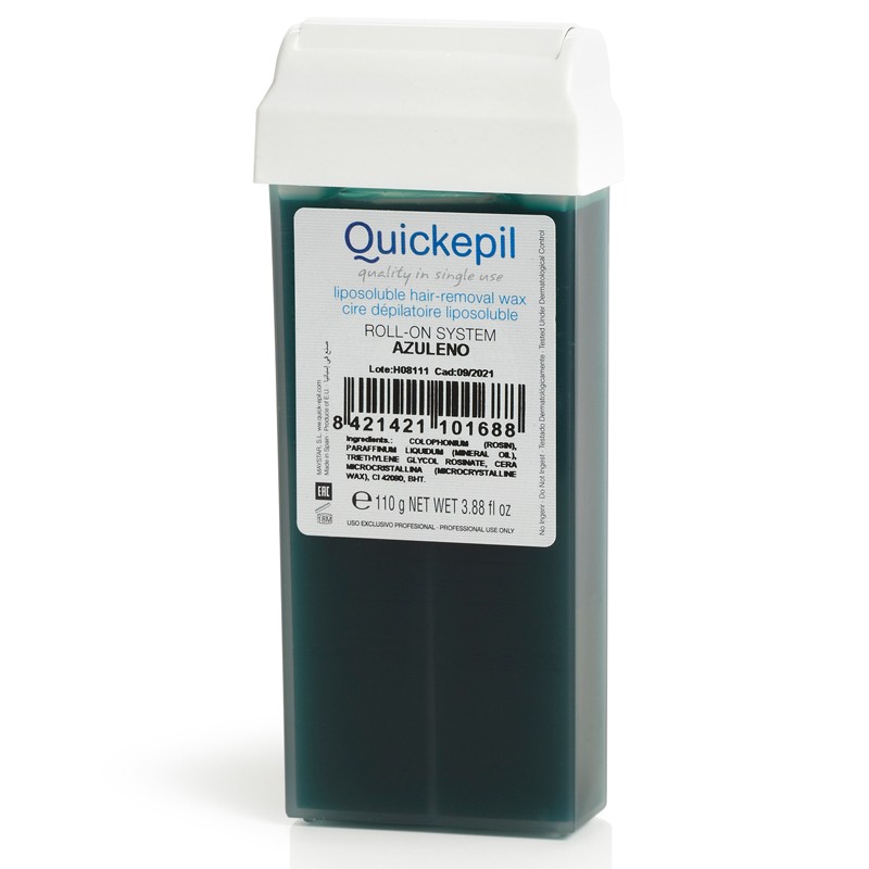 Wosk QUICKEPIL roll-on jest specjalnie stworzony dla kosmetyczek, które szukają znakomitych rezultatów. Dzięki specjalnej recepturze rolka rozciąga wosk na znacznie cieńsze paski co powoduje, że stygnie niemal natychmiast minimalizując pieczenie. Produkt jest następnie łatwo usunąć za pomocą pasków. Zawarty w nim azulen ma działanie łagodzące i przeciwzapalne, doskonały do skóry wrażliwej, skłonnej do podrażnień.