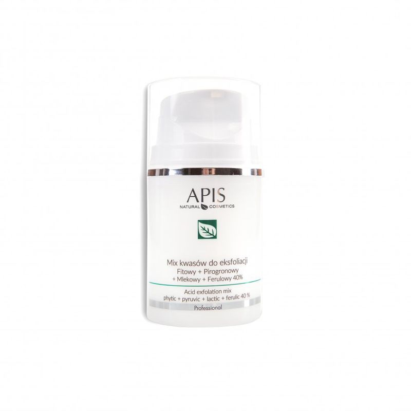 Apis Mix kwasów do eksfoliacji (Fitowy + Pirogronowy + Mlekowy + Ferulowy 40%) polecany do cery z oznakami starzenia, przebarwieniami, rozszerzonymi naczynkami, a także do cery tłustej, trądzikowej z rozszerzonymi porami. Jet to innowacyjne połączenie czterech kwasów o pH 1,4 działających na wielu płaszczyznach o niezwykłych właściwościach. Preparat intensywnie złuszcza warstwę rogową naskórka, działa przeciwstarzeniowo, obkurcza rozszerzone naczynka, rozjaśnia przebarwienia. Zamyka rozszerzone pory skóry i ma działanie bakteriostatyczne. Wykazuje także aktywność antyoksydacyjną. Mix kwasów to produkt przeznaczony do chemicznego złuszczania.