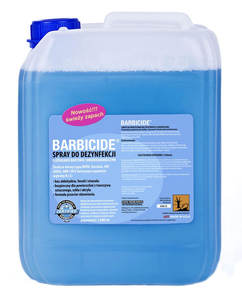 Spryskać powierzchnię preparatem BARBICIDE, odczekać wymagany czas kontaktu preparatu z powierzchnią i wytrzeć.