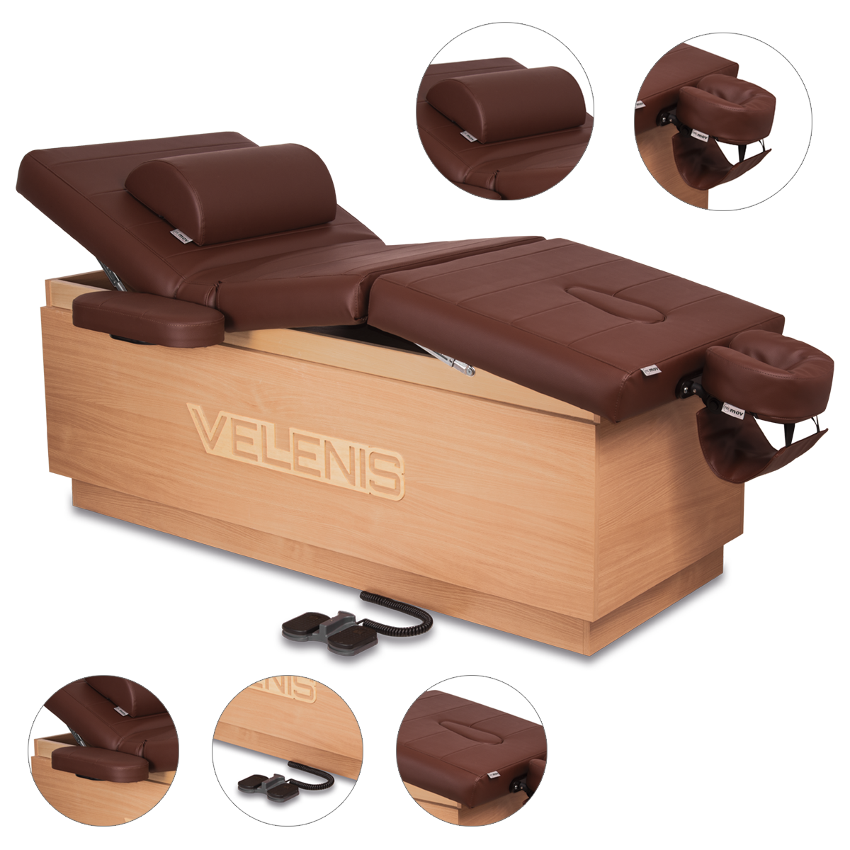 Leżanka Velenis P wyróżnia się nie tylko stylowym designem z drewna o eleganckim wykończeniu i wyraźnym logo Velenis, ale także niezrównaną funkcjonalnością. Dzięki elektrycznej regulacji wysokości sterowanej za pomocą pilota nożnego, terapeuci mogą płynnie i wygodnie dostosować pozycję leżanki do potrzeb klienta. Regulowane oparcie i segmenty na ramiona pozwalają na pełne dopasowanie, co zwiększa komfort i wsparcie podczas każdego zabiegu. Ta leżanka jest idealna zarówno do masażu klasycznego, jak i specjalistycznych terapii, nadając gabinetowi prestiżowy charakter.