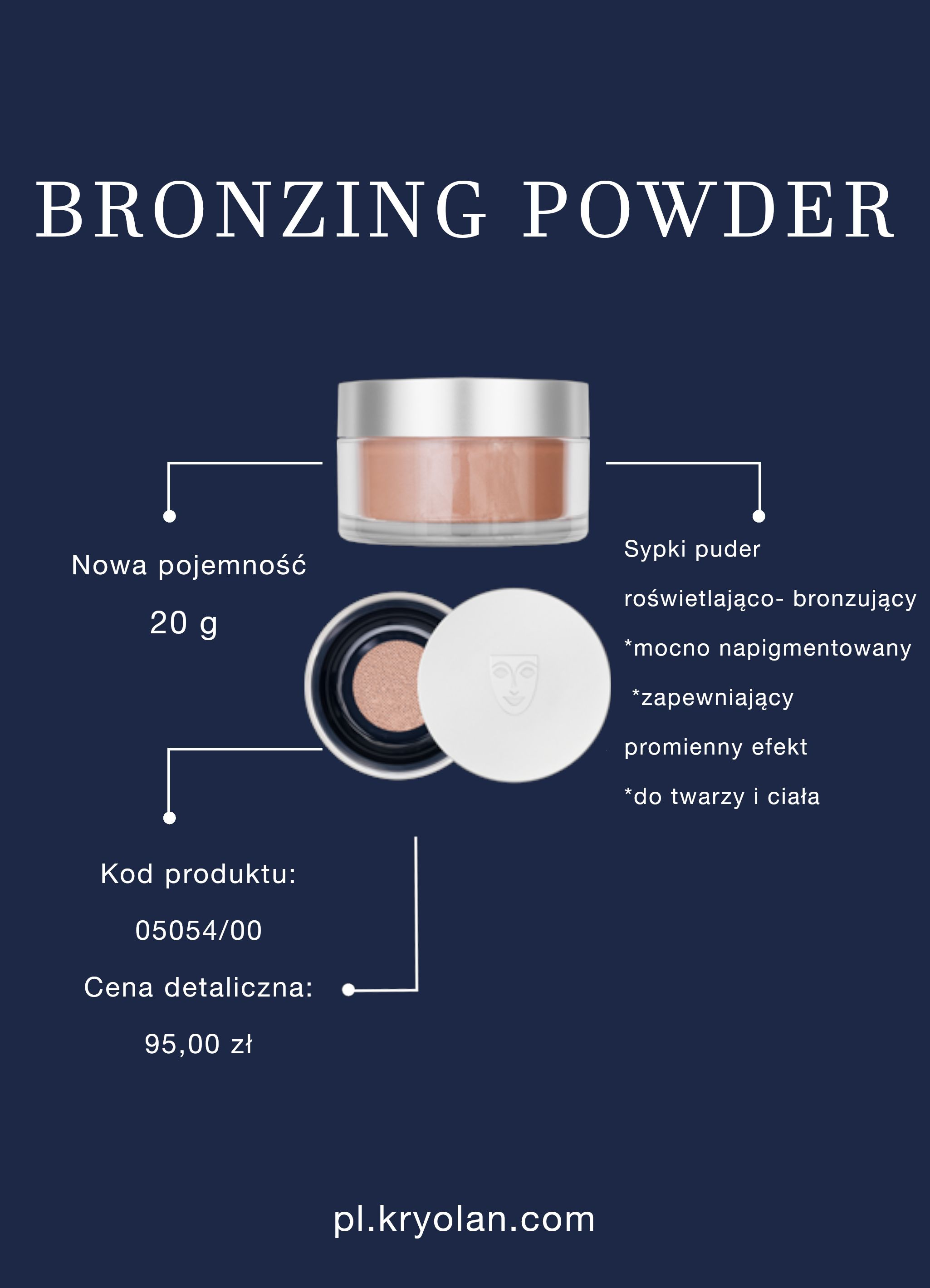 Bronzing Powder marki Kryolan (wiodącej na całym świecie profesjonalnej marki oferującej wysokiej jakości kosmetyki charakteryzatorskie, kolorowe i pielęgnacyjne). Nabłyszczający puder brązujący. Idealnie nadaje się do stosowania miejscowego (oczy, policzki, dekolt i ramiona), ale też do całego ciała. Ujednolica cerę oraz wzmacnia naturalny blask skóry. Sprawia, że cera wygląda świeżo i promieniście. Łatwo się go aplikuje nie powodując smug. Produkt został wzbogacony o kratkę dozującą. Całość zamknięta w praktycznym słoiczku.
