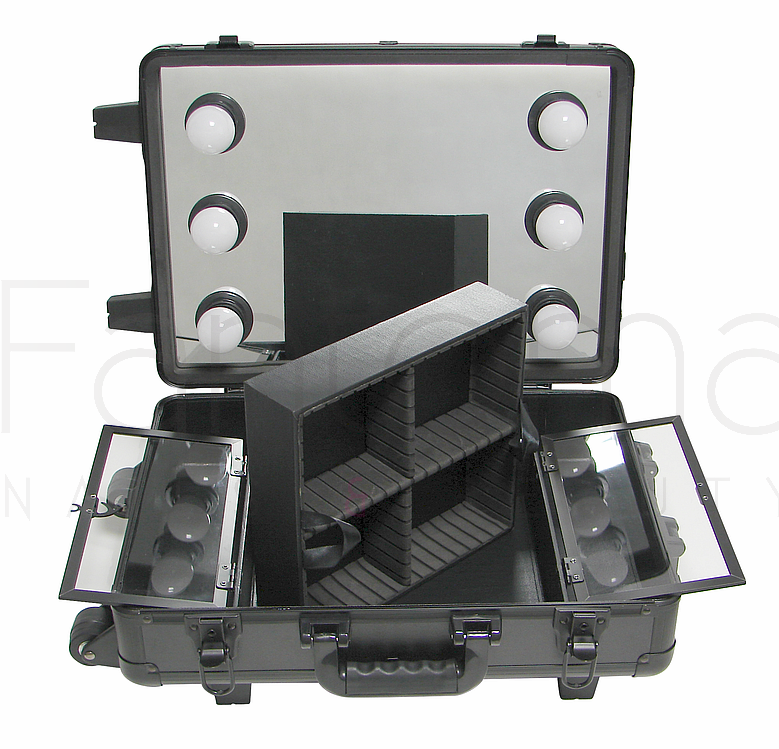 Mobilny kufer na kółkach z przenośną stacją do makijażu.