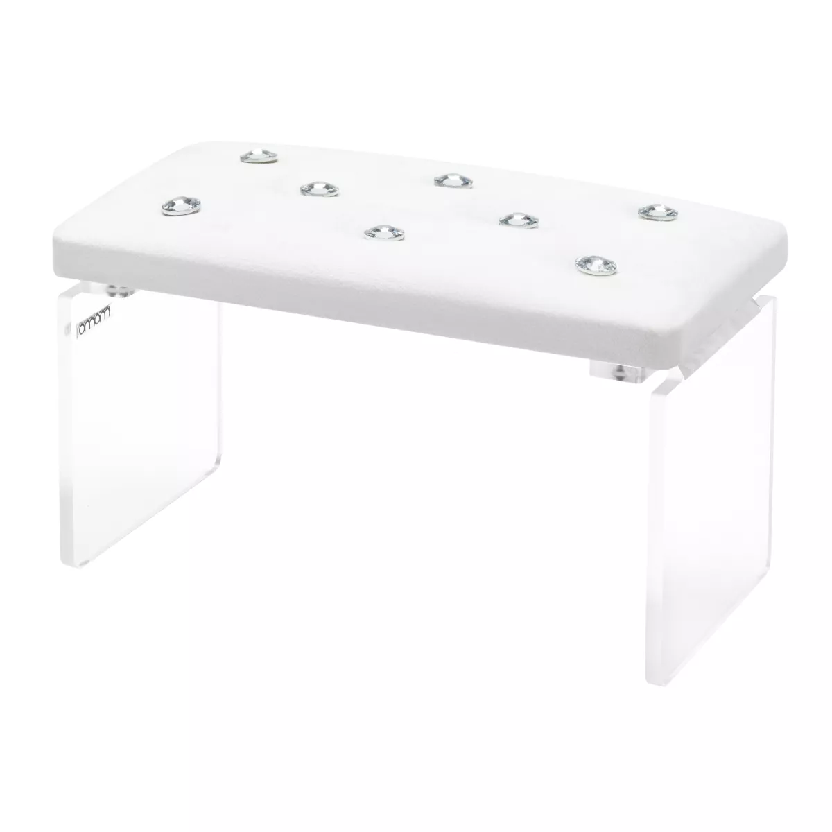 Odpowiednia wysokość podpórki zapewnia wygodną pozycję zarówno dla klienta, jak i dla stylistki. Poprawna postawa stylistki minimalizuje obciążenie kręgosłupa, skutecznie redukując ból pleców, a klientce zapewnia to większy komfort i relaks. Silikonowe elementy na nóżkach chronią blat przed zarysowaniami i zapobiegają przesuwaniu się na stole, gwarantują stabilność. Stelaż z tworzywa sztucznego i łatwa w czyszczeniu skóra syntetyczna zapewniają długą trwałość produktu, a ozdobne kryształki nadają mu wyjątkowy wygląd.