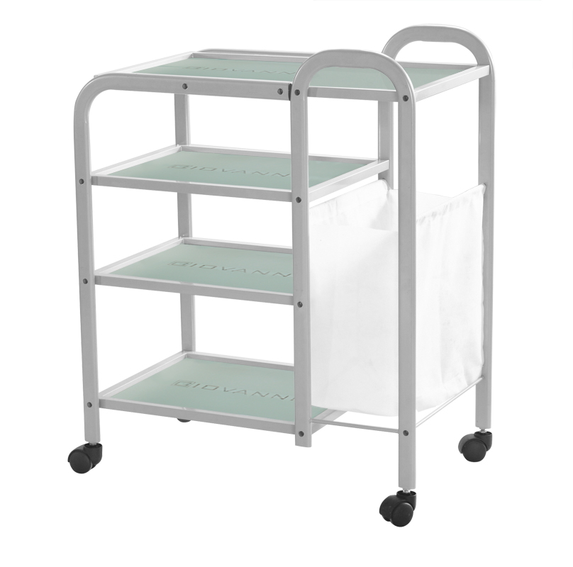 Funkcjonalny metalowo-szklany stolik na gumowych kółkach. Stolik posiada cztery szklane półki z grawerowanym logo firmy GIOVANNI. Dodatkowym atutem stolika jest przymocowany do niego worek na brudne ręczniki i opaski kosmetyczne.