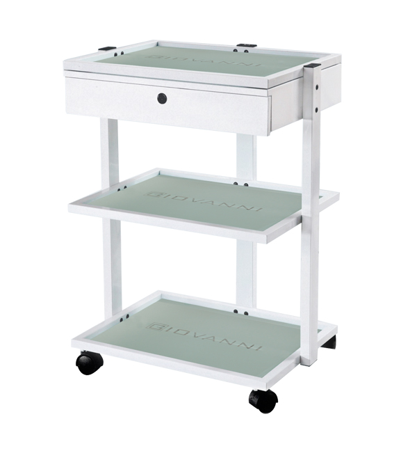 Elegancki metalowo-szklany stolik, na gumowych kółkach. Stolik posiada pojemną szufladę i dwie szklane półki z grawerowanym logo firmy GIOVANNI. Istnieje możliwośc przymocowania do stolika lampy-lupy.